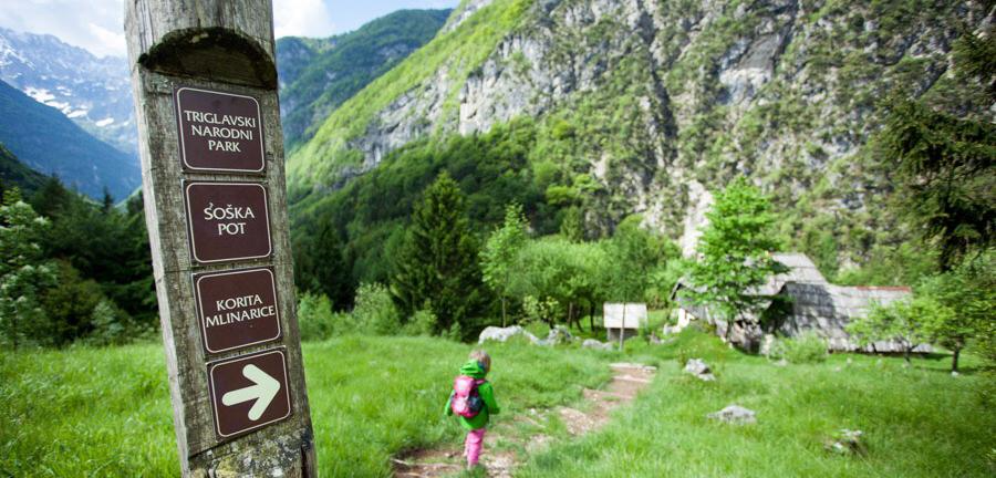The upper part of the Soča Trail starts at the Hut by the Source of the Soča and ends at Na Logu in Trenta with a visit to the Triglav National Park Information Centre.